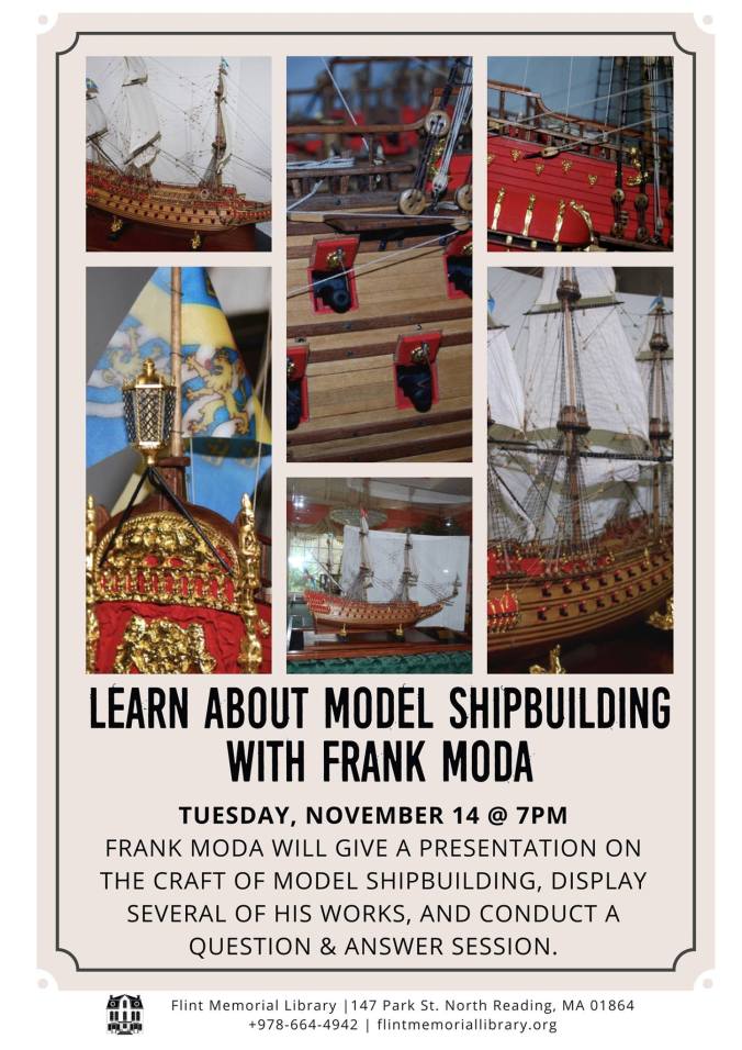 Those of you living in Massachusetts might be interested in attending a ship modeling talk given by the very talented ship modeler Frank Moda. He’ll be speaking at the Flynt Memorial Library in North Reading, MA, on Tuesday, November 14th at 7pm.
