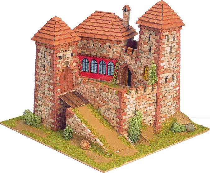 The Castle 6 Burgen kit, Domus kit 40906 shown completed above is a 1/65-scale kit built-up, brick by brick, with real brick and wood materials, into the castle shown here. The kit includes real miniature bricks, so the kits are very heavy. The kits also include glue, paints and scenery material. The kits begin with a cardboard frame, which forms a guide for gluing the bricks into place.