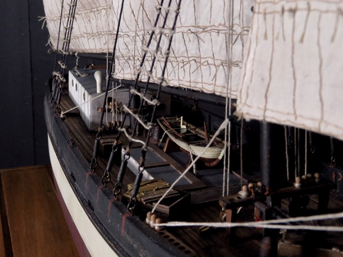 This is a wooden model of a typical Q-Ship used in WWI and WWII in an effort to lure German submarines to attack them. Ships like this were equipped with deck guns that were disguised or hidden, making the vessel look like a helpless merchantman. When a U-boat closed in, hungry for the kill, the Q-Ship would quickly reveal it’s armament and attack.