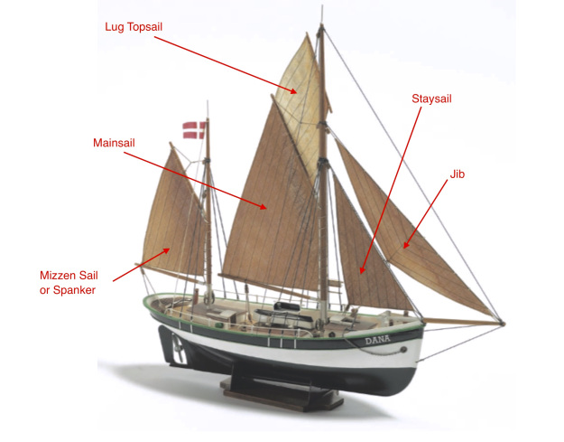 Before going on, let me make sure to define the boat’s rig for those not familiar with some of the terms. As I mentioned before, the Dana is a ketch-rigged fishing boat. This means that it has two masts: a mainmast and a shorter mizzenmast. There are five sails shown with this kit. I’ve labeled them in the image below for those not familiar with the configuration or terms.