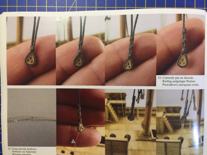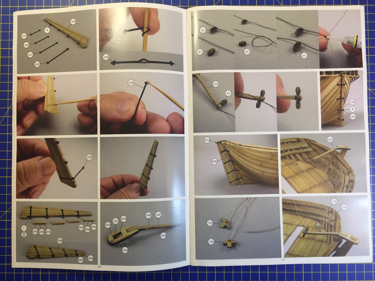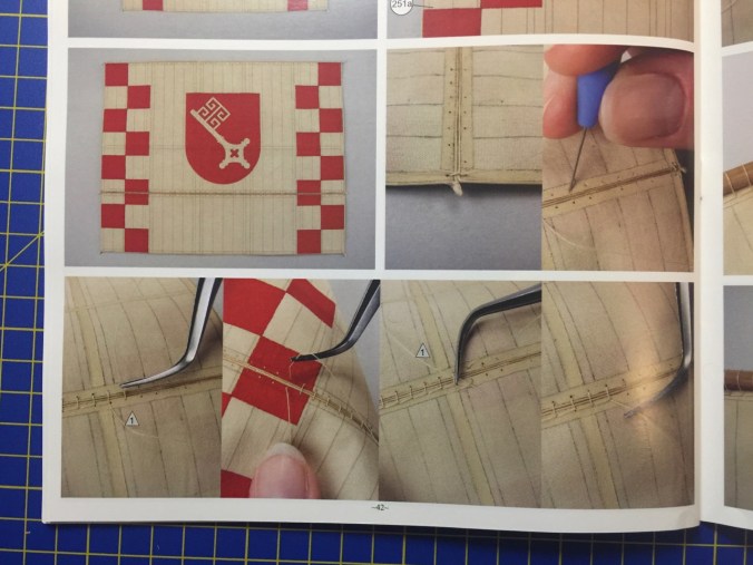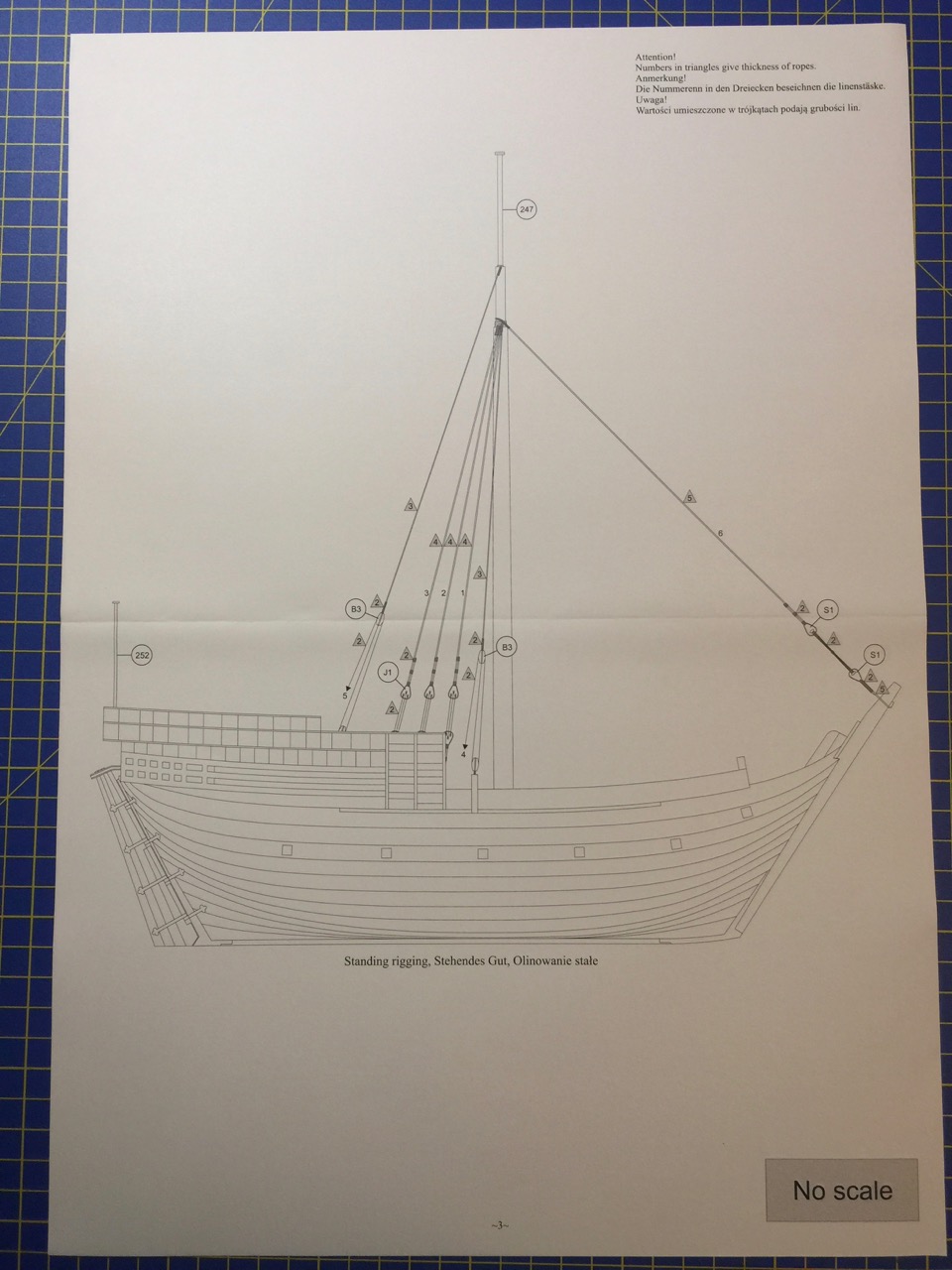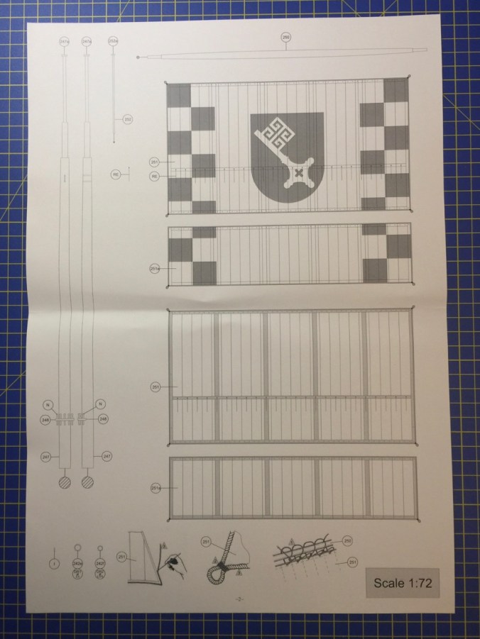 In addition to the instruction booklet, which is really big enough and appears complete enough to call it an instruction manual, there are a three large format sheets of diagrams. Specifically, there is one double-sided sheet with scale drawing of the sail and its details on one side and a short paragraph of text on the history of the ship on the other. Another double-sided sheet and one single sided sheet provide clear rigging and belaying point diagrams. Lines are clearly numbered, so it’s very easy to follow which line gets tied off where.