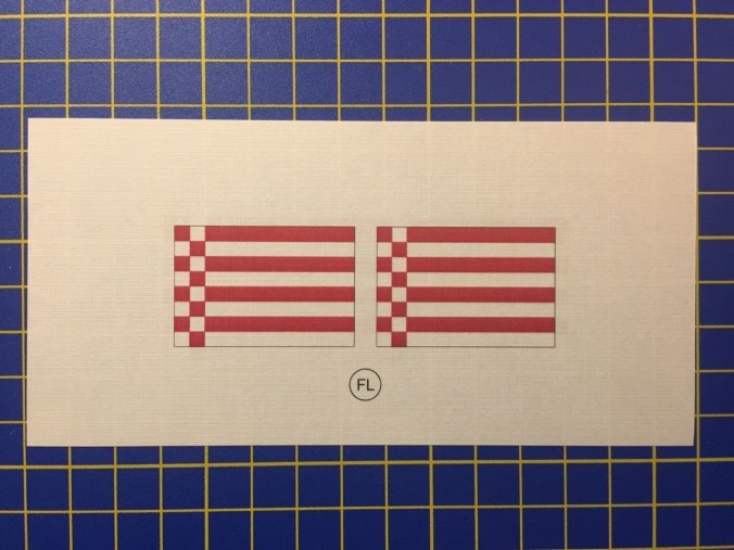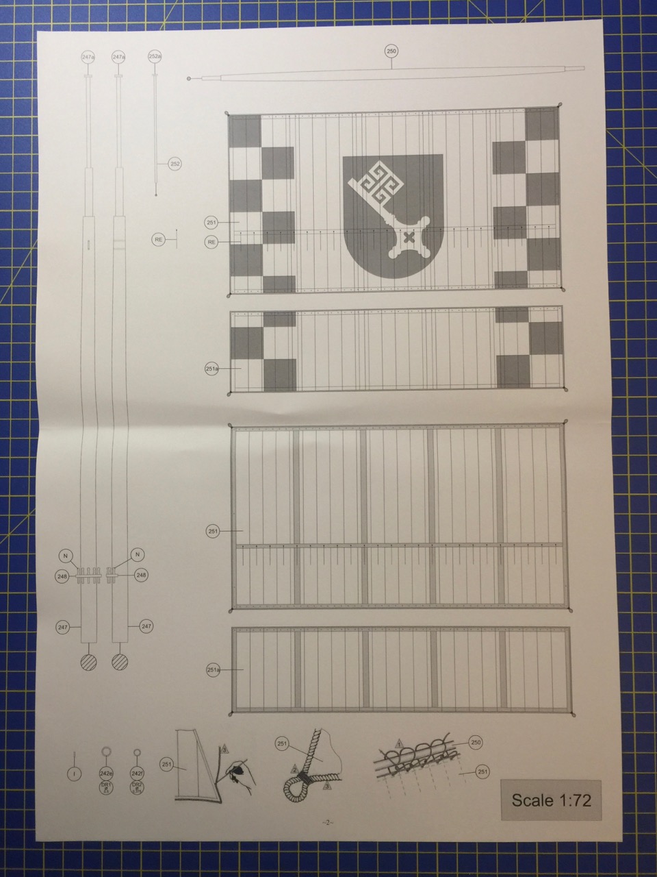 Finally, to complete the model is a pair of colorful, pre-printed flags, as well as a pre-cut, partly printed sail in two parts.