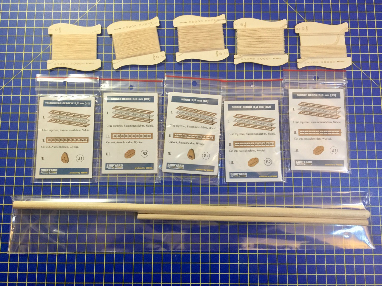Rigging line, wooden dowels (some things are easier to make from wood on a card model), and six packages of laser-cut blocks, hearts, and deadeyes – some assembly required.