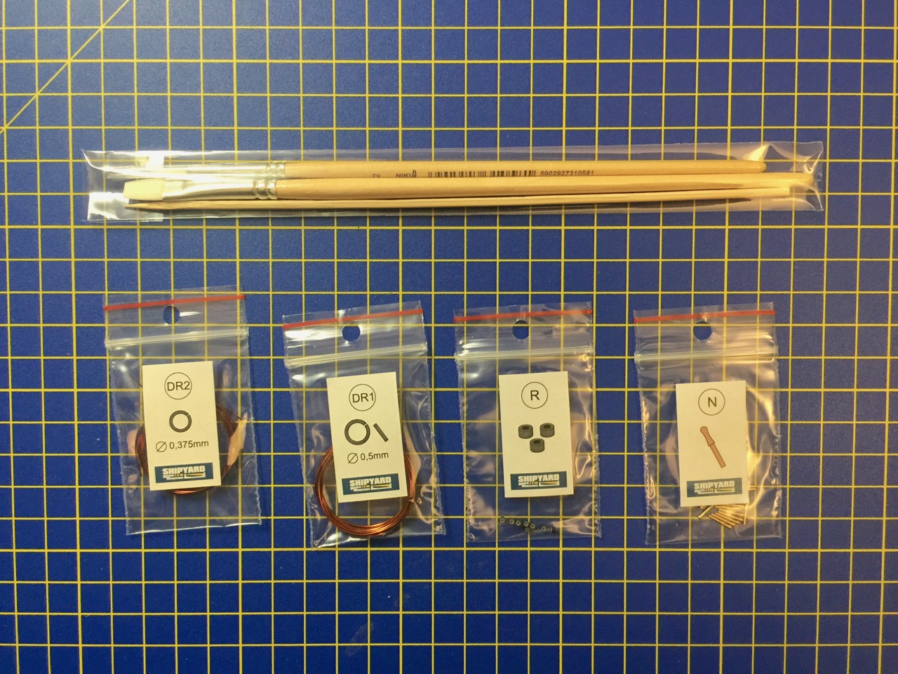 Miscellaneous parts and items are packed into separate cardboard boxed inside the main kit box. These include a set of paint brushes, two sizes of wire, brass belaying pins,  and parrel beads…