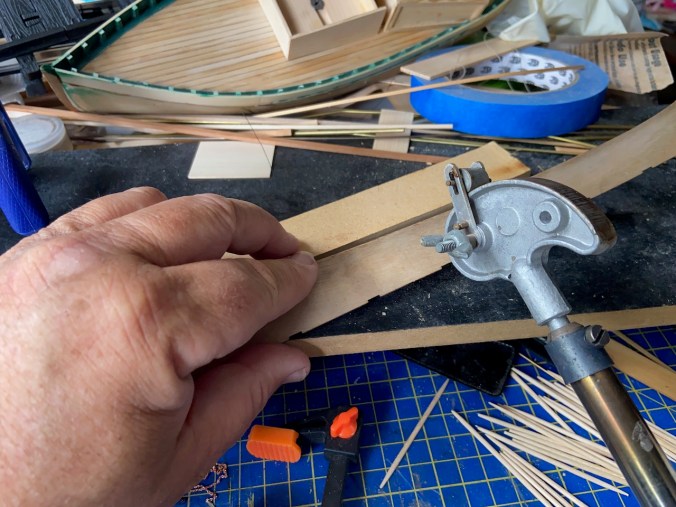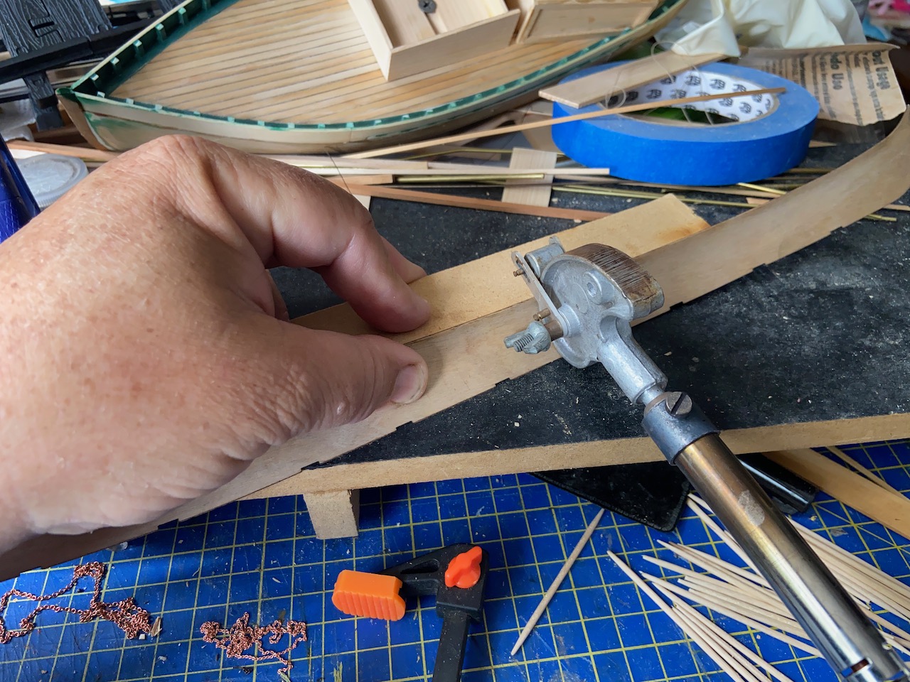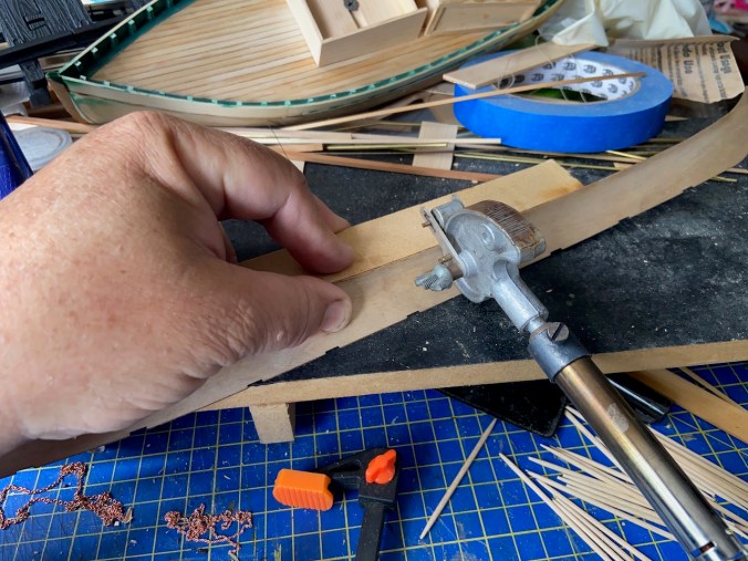 The next step involves preparing the hull plank pieces, of which there are only two. These pieces need to be shaped to fit the curved frames. The easiest way to do this is with an electric plank bender, as described in the kit instructions.