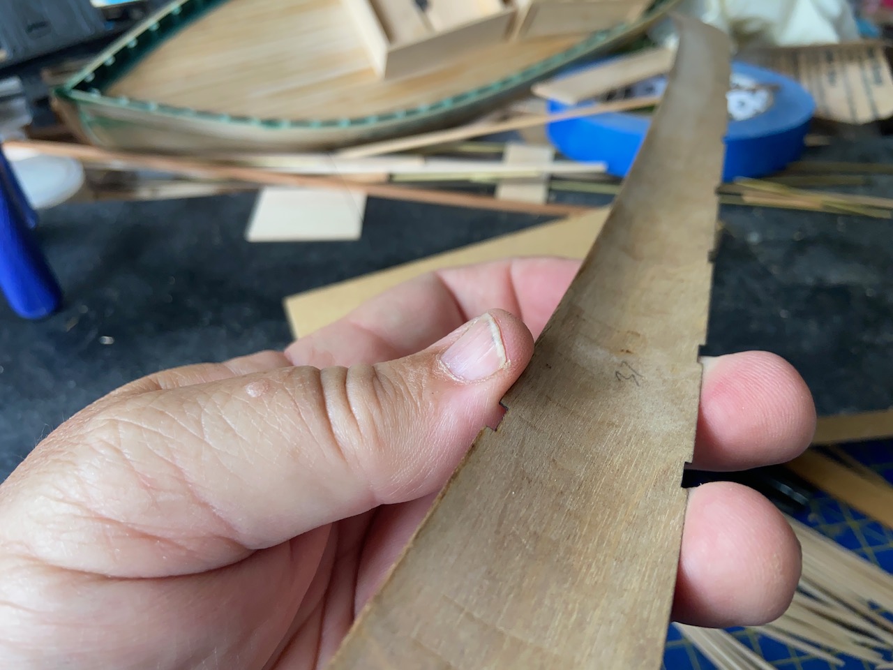 The stern end is the most confusing, as the bottom is difficult to curve upward at the very end. Hopefully, this will clean up easy enough later. Also, I had a couple frames pop out during the fitting process, but nothing broken. It was a pretty simple matter to glue them back into place.