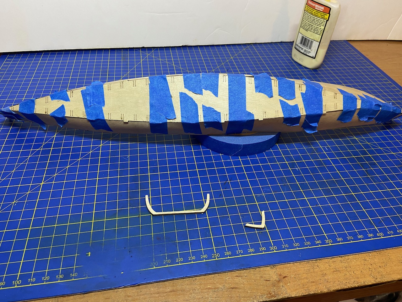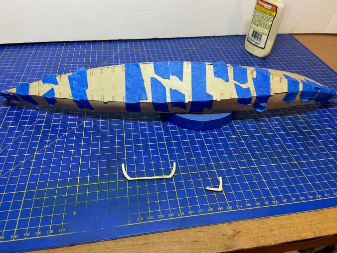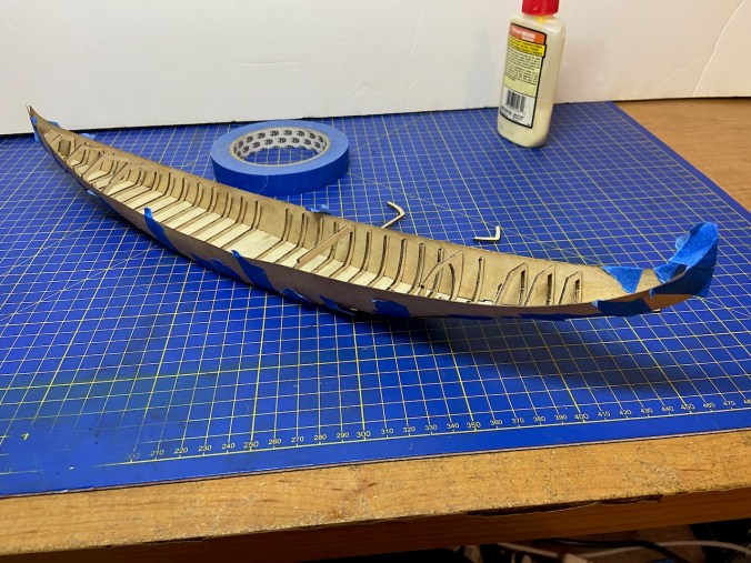 I taped the now pre-curved hull planks into place to make sure everything would fit together properly. The hull sides and bottom are notched to help properly align the parts. Fitting it all together is a bit tricky as the bottom has to also curve, rising up at the ends.