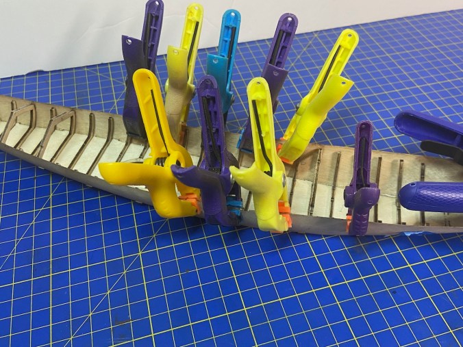 Once the gluing of the bottom piece was done, I pulled off most of the masking tape and began the process of the gluing the frames to the hull sides, again using slow-curing CYA glue.