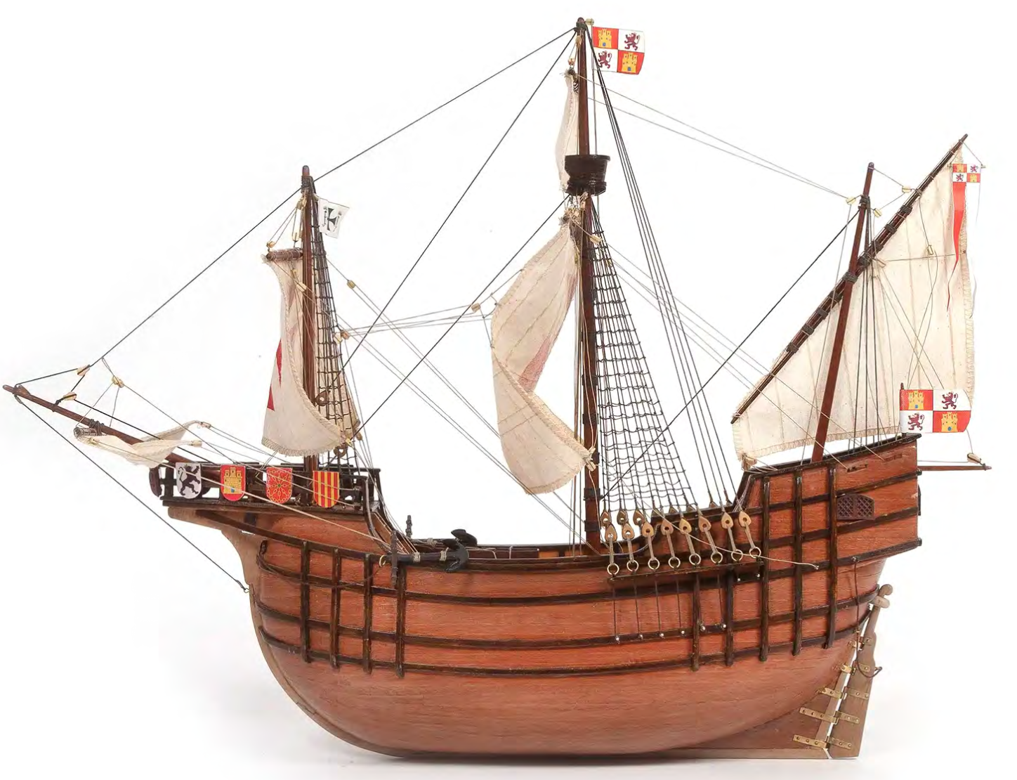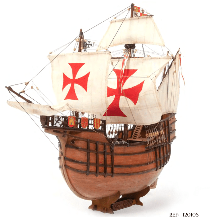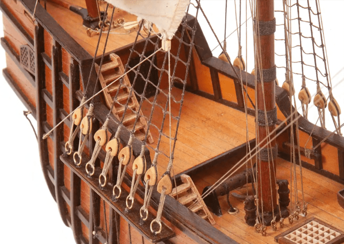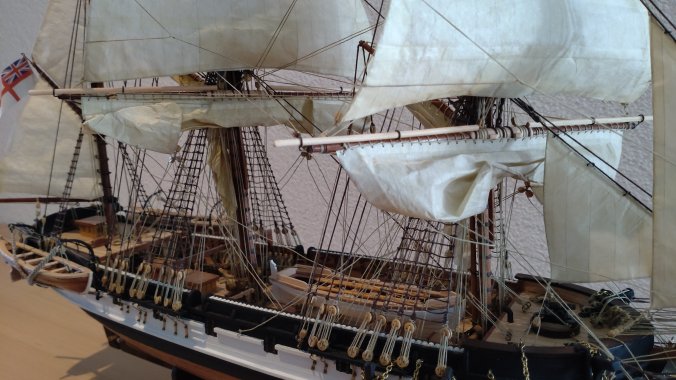 Note too, how the builder angled the yards slightly, adding a more lifelike, natural appearance of an actual ship on the seas. The few figures he put on the decks, and the curling shape given to the flags only add to that lifelike feel.