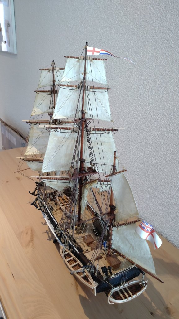 The builder comments that he took his build slow but steady, and that he made some of his own improvements along the way. This includes making his own sails out of silkspan, which is a paper-like cloth. While the kit includes a full set of pre-sewn sails, the thin material he used gives a more scale appearance to the model.