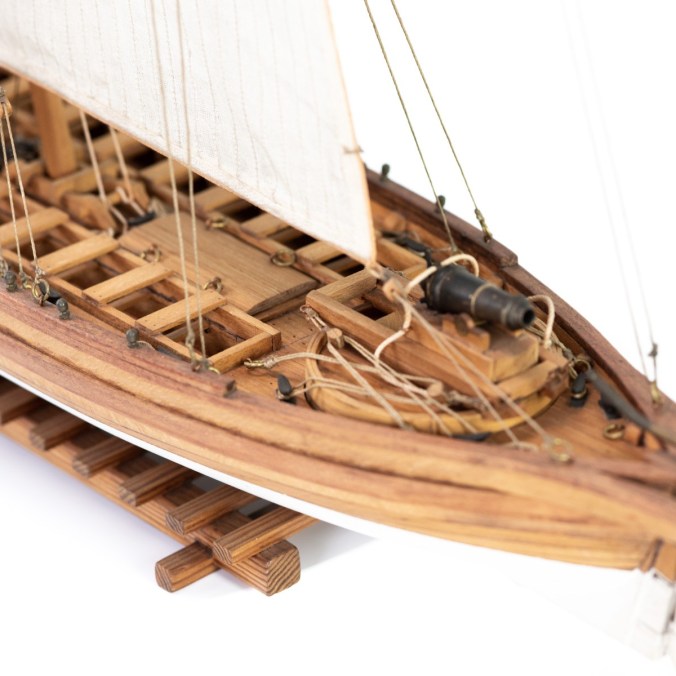 This kit makes for an interesting build of a unique type of craft that formed an important part of American history. The completed model’s graceful lines are certain to draw attention. The model is ideal for those who want to build something attractive that doesn’t require as much time as it takes to build a square rigger or any of the larger warships with their rows of gunports and cannons. But, with the large, detailed long gun and carronade in their swivel mounts, it carries just enough armament to make it stand out.