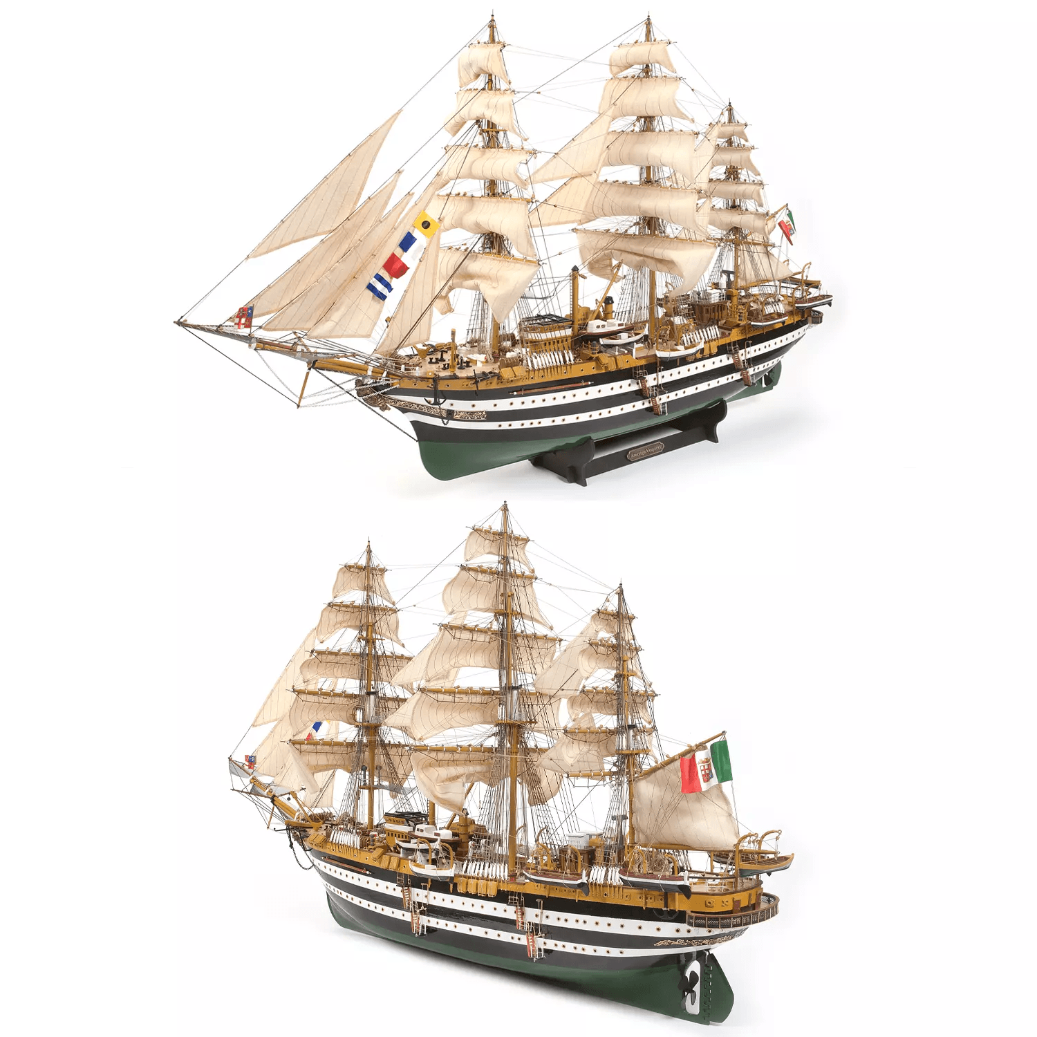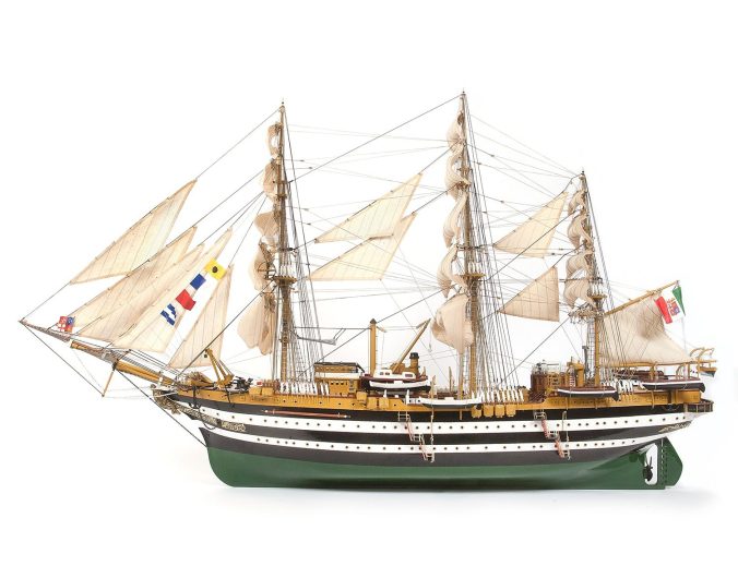 Amati’s kit measures kit measures about 18.5″ long and features a double-planked hull on a framework of laser-cut bulkheads. Bronzed metal barrels are included for one long gun and one carronade. Printed sailcloth is included for the two lateen sails. Three sheets of plans are included, as is a step-by-step instruction guide. The instruction guide is printed in Italian, but an insert includes all the text in english.