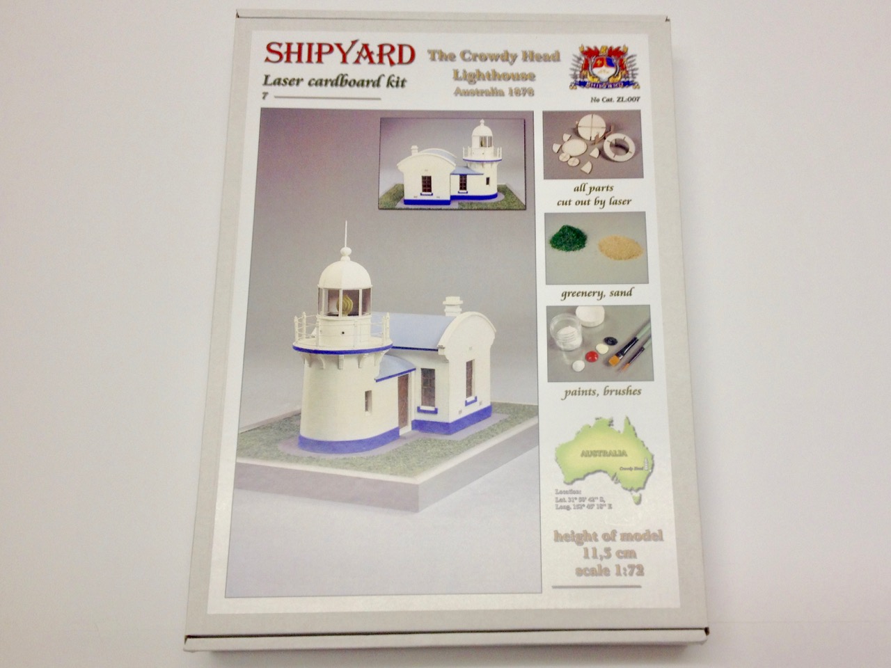 To recap from my previous post, this is my second completed paper model. The first was the British naval cutter HMS Alert, which I build from Shipyard’s line of Paper Model kits. The Crowdy Head Lighthouse kit, I chose from Shipyard’s Laser Cardboard Kit line because it is not all that much more expensive than the other versions of this model, plus it includes paints, brushes, and landscaping material consisting of fake grass and real sand.