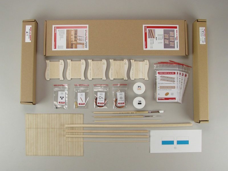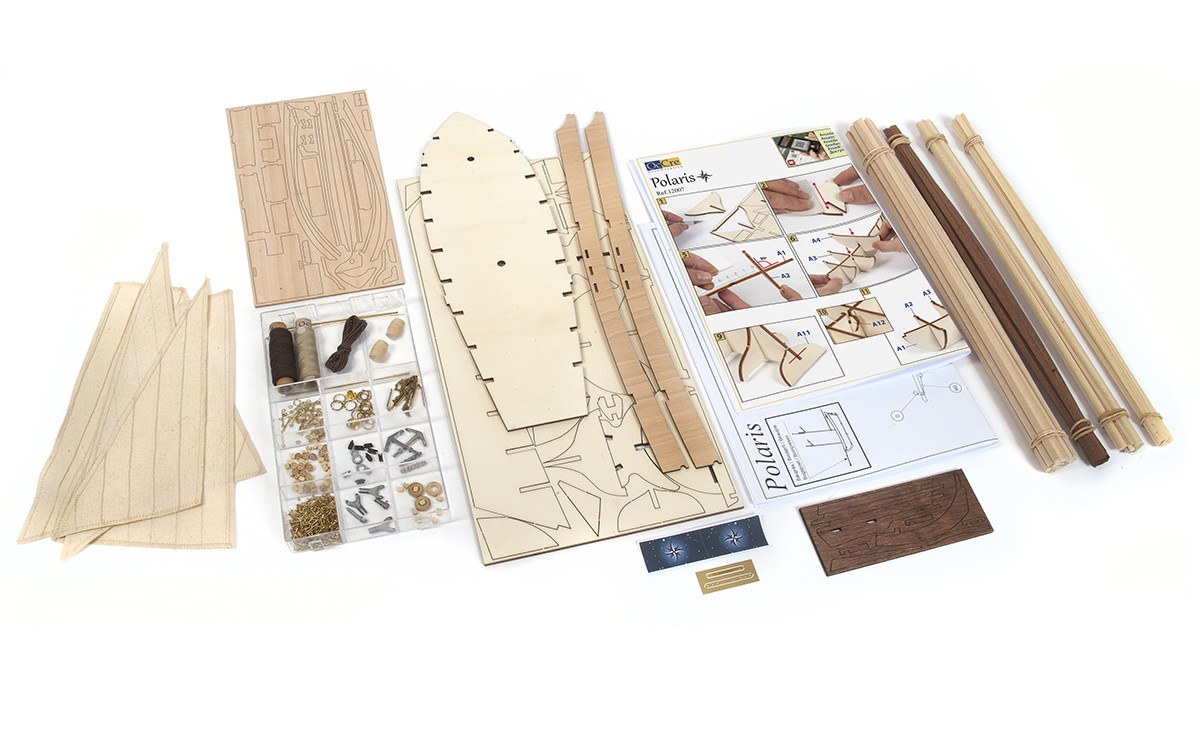 And the kit includes everything you see here, from wooden stock to fittings of brass, cast metal, and wood; major wooden parts are finely laser cut; and the kit even includes a full set of pre-sewn sails, all for one low price.
