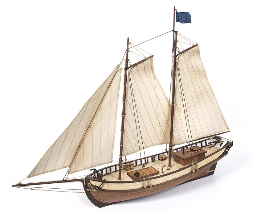 The model features the simple schooner rig, easy hull shape, and all the basic features common to wooden sailing ships, making an ideal entry-level wooden ship model kit. It is a 1:50 scale model that measures just under 23″ long and roughly 17.5″ high.