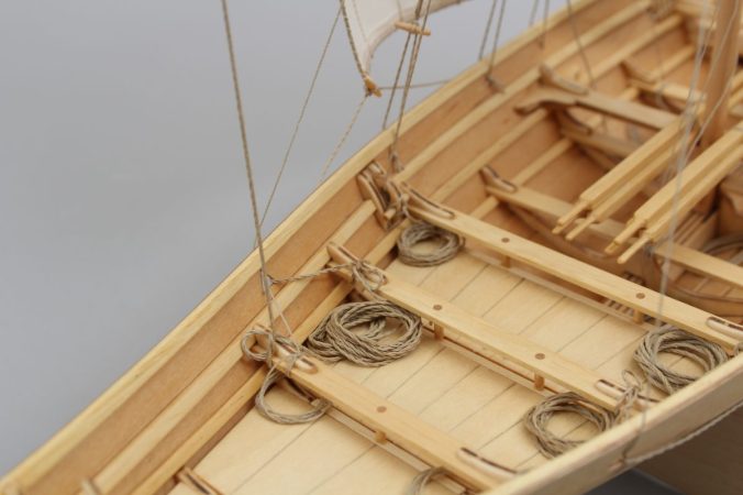 If you notice the fancy decorative inlaid wood pattern in the photos above and below. Amati includes a strip of this pre-made wood. The inlay pattern actually varies between kits, so your own model will likely be different from these. The kit also includes sailcloth pre-printed in color.