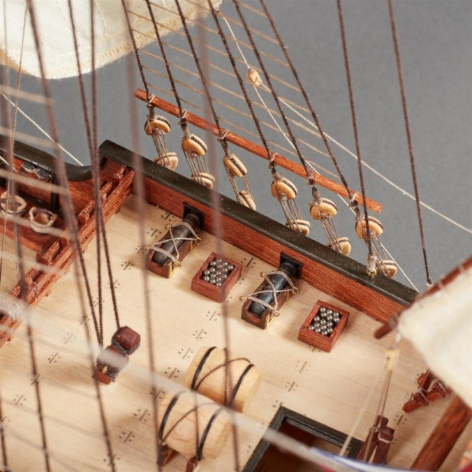 This 1:64-scale wooden model ship it measures over 50″ in overall length, and nearly 35″ tall. This is a monster of a kit with tons of details, including a full, open gun deck – no dummy cannons here – a detailed great cabin, and much, much more. Here’s a sample of photos of this incredible new kit.